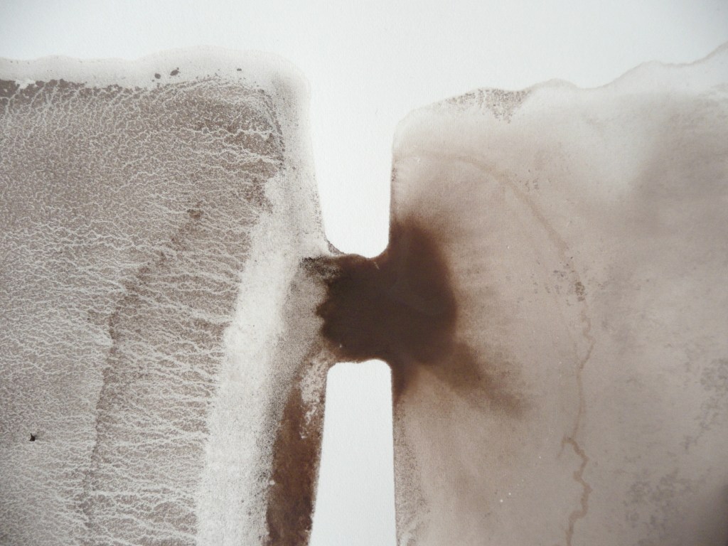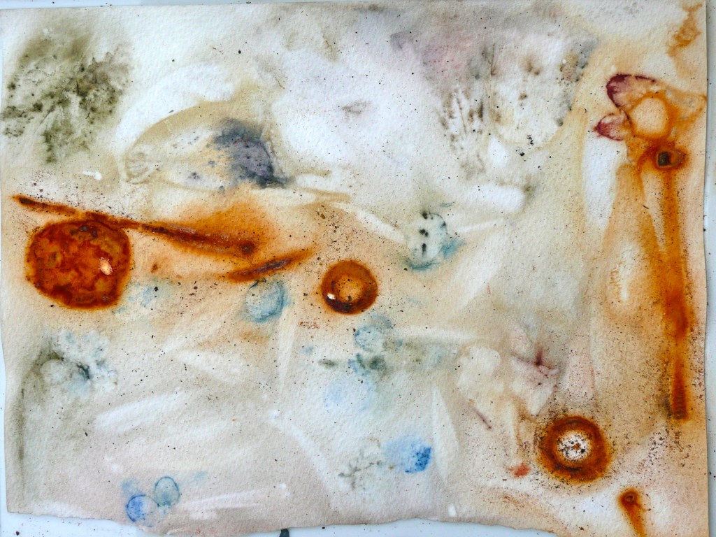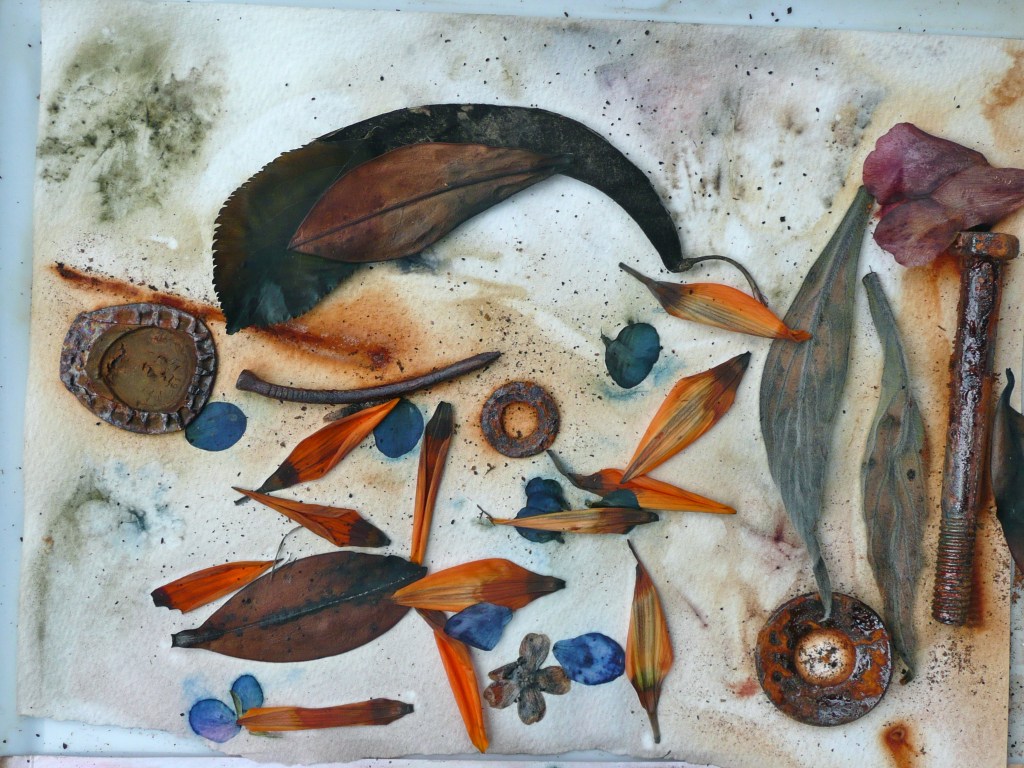 The cotton bundle was a little disappointing, plenty of yellow and a pale tan colour plus some nice marks left by the (previously used) cotton thread for tying. I think the yellow must have come from the lichen on the bark. The poplar leaf is only just visible at the foot of the fabric, the green leaf point just to the left of the piece of cotton thread.